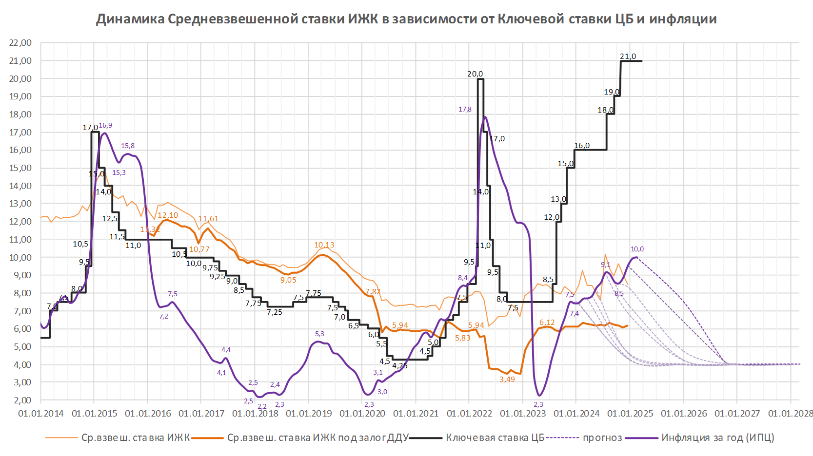 В базовом сценарии для возвращения инфляции к цели потребуется более продолжительный период поддержания жестких денежно-кредитных условий в экономике, чем прогнозировалось в октябре. Годовая инфляция, по оценке на 10 февраля, составила 10,0%. По прогнозу Банка России, с учетом проводимой денежно-кредитной политики она снизится до 7,0% — 8,0% в 2025 году, вернется к 4,0% в 2026-м и будет находиться на цели в дальнейшем.