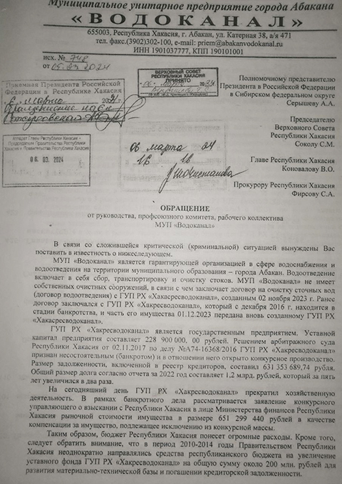 «Вновь созданное предприятие ГУП РХ «Хакасресводоканал» опять выражает намерение охватить Усть-Абаканский район и Абакан. Но… история повторяется. Неужели бюджет республики настолько богат, что может себе позволить повторение ошибок и нанесение ущерба для бюджета столь нецелесообразными расходами», - говорится в письме.