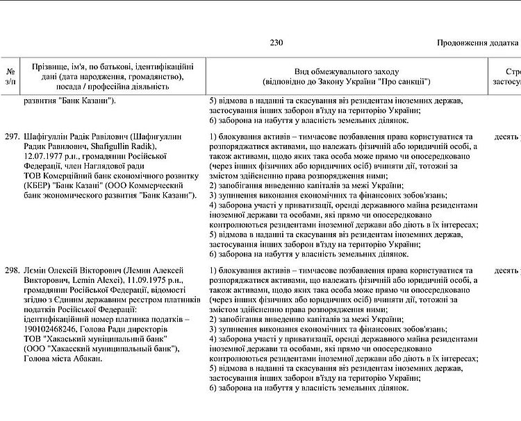 Санкции Украины предполагают блокировку активов, полное прекращение торговых операций, запрет на вывод капиталов из Украины, лишение государственных наград Украины и запрет на приобретение в собственность земельных участков.