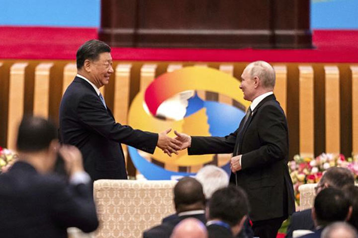 На фото: председатель КНР Си Цзиньпин и президент РФ Владимир Путин (слева направо) на III Международном форуме «Один пояс — один путь» в Доме народных собраний.