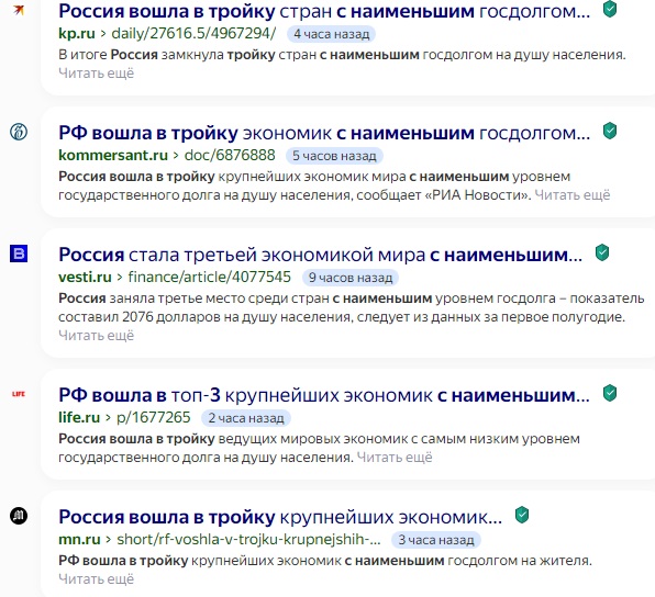 Таким образом, Россия является страной с одним из самых низких уровней государственного долга, что является важным экономическим достижением. Однако, несмотря на эти положительные новости, некоторые российские СМИ, возможно из-за некомпетентности или злого умысла, стараются подорвать доверие населения к этим данным.