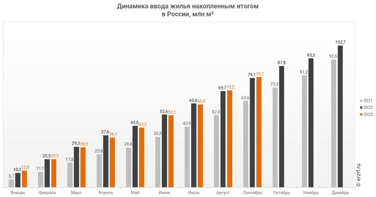 В январе — сентябре 2023 года в России введено 79,7 млн м2 жилья. Это на 0,7%, или на 0,6 млн м2 больше, чем за аналогичный период 2022 года.