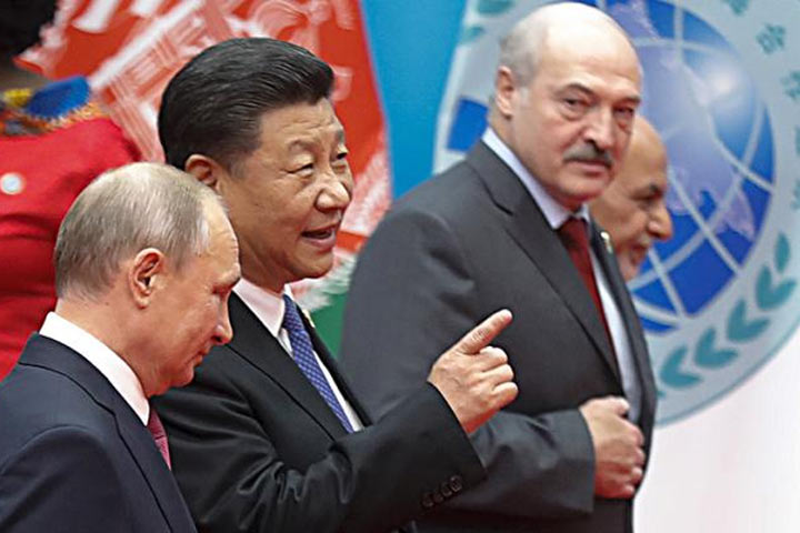На фото: президент РФ Владимир Путин, председатель КНР Си Цзиньпин и президент Белоруссии Александр Лукашенко (слева направо) (Фото: Михаил Метцель/ТАСС) На саммите ШОС Белоруссию примут,
