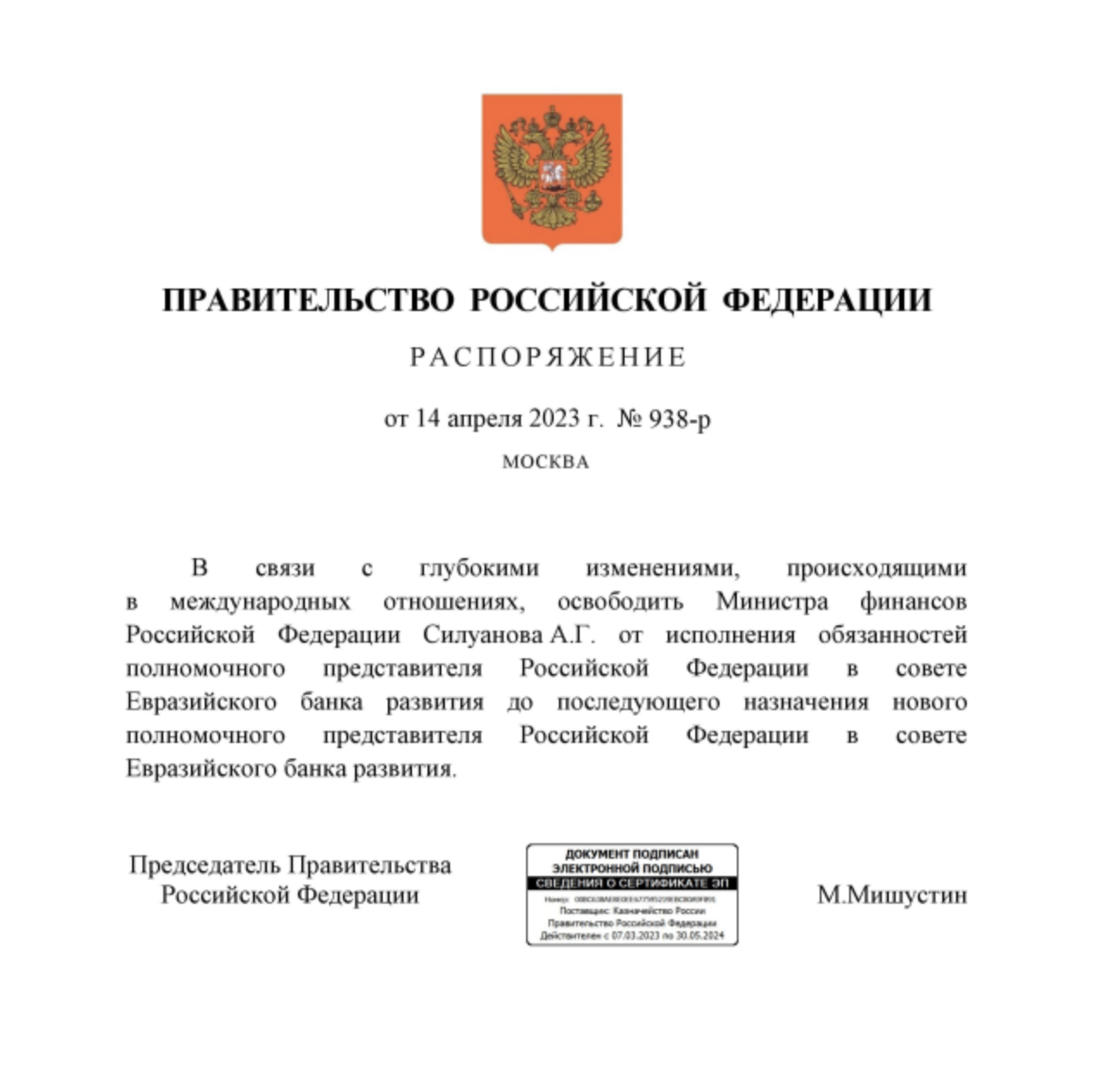 Премьер-министр Михаил Мишустин своим распоряжением снял главу Минфина Антона Силуанова с должности полпреда России в совете Евразийского банка развития (ЕАБР).