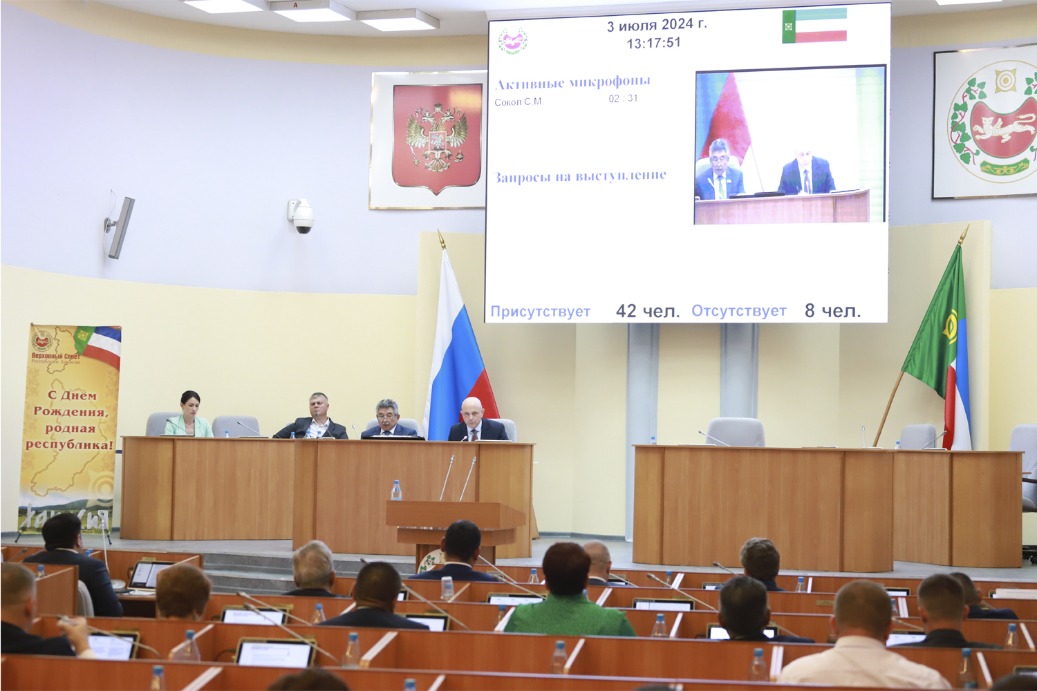 Фото: Верховный Совет Республики Хакасия«Мы с вами приняли важные социальные законы, в числе которых и предусматривающие дополнительные меры поддержки наших участников СВО и их семей. Отдельный блок законов, принятых действующим созывом, добавил меры социальной поддержки медицинских работников, многодетных семей и детей-сирот, расширен перечень категорий граждан, имеющих право на бесплатную юридическую помощь. Добавлю, что наша поддержка специальной военной операции не ограничивается только законотворческой деятельностью. Депутаты Верховного Совета и сотрудники Аппарата регулярно участвуют в сборе гуманитарных грузов и денежных средств. В июне депутаты, работающие в Верховном Совете на постоянной основе и специалисты комитетов, перечислили однодневный заработок в фонд поддержки СВО» , - сказал Сергей Сокол.
