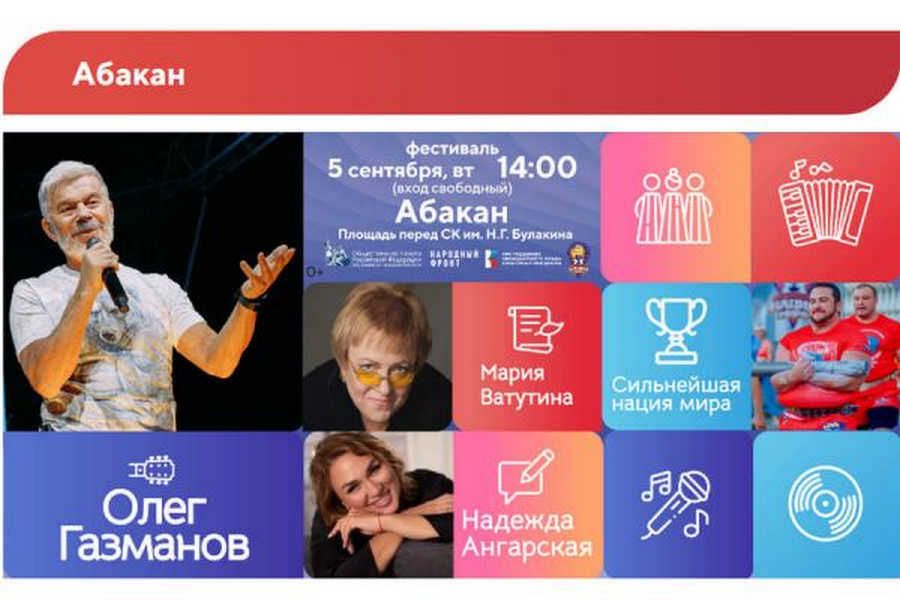 Кульминацией программы станет выступление народного артиста Российской Федерации Олега Газманова и группы «Эскадрон». Также абаканцы встретятся с известными поэтами, увидят экстремальное силовое шоу и смогут записать видеообращения в поддержку военнослужащих, участвующих в СВО.