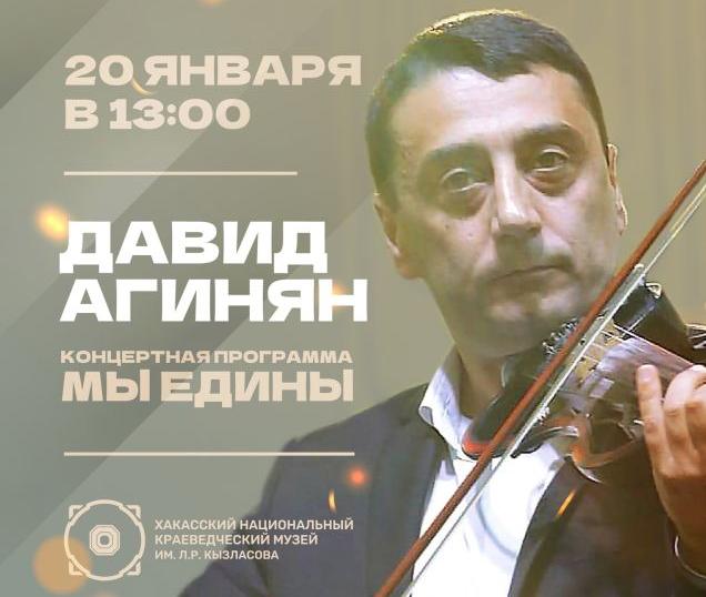 Благотворительная концертная программа «Мы едины» скрипача – виртуоза Давида Агиняна состоится в Хакасском национальном краеведческом музее имени Л.Р. Кызласова 20 января в 13.00. За плечами музыканта - множество концертов в России и Европе, но этот концерт будет особенным, ведь музыкант будет играть в одной из необычных экспозиций музея – зале каменных изваяний «Древнее искусство Хакасии».