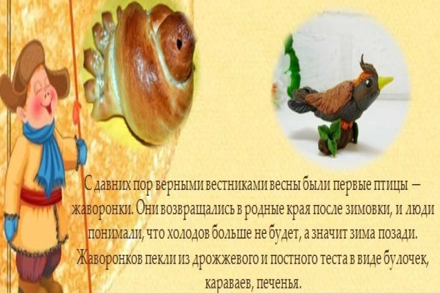 Создавать организаторы предлагают жаворонков — верных вестников весны. Возвращение этих птиц в родные края после зимовки означало, что холодов больше не будет, а зима позади. В старину жаворонков пекли из дрожжевого и постного теста в виде булочек, караваев, печенья. Вот и конкурсантам нужно сделать то же самое.