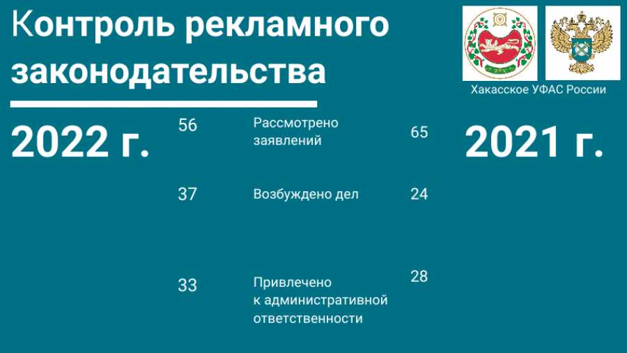 За весь 2022 год в УФАС Хакасии поступило 56 заявлений от жителей республики. Все они подозревали рекламодателей и рекламораспространителей в нарушении действующего законодательства. В 2021 году в региональную антимонопольную службу поступило 65 таких заявлений.