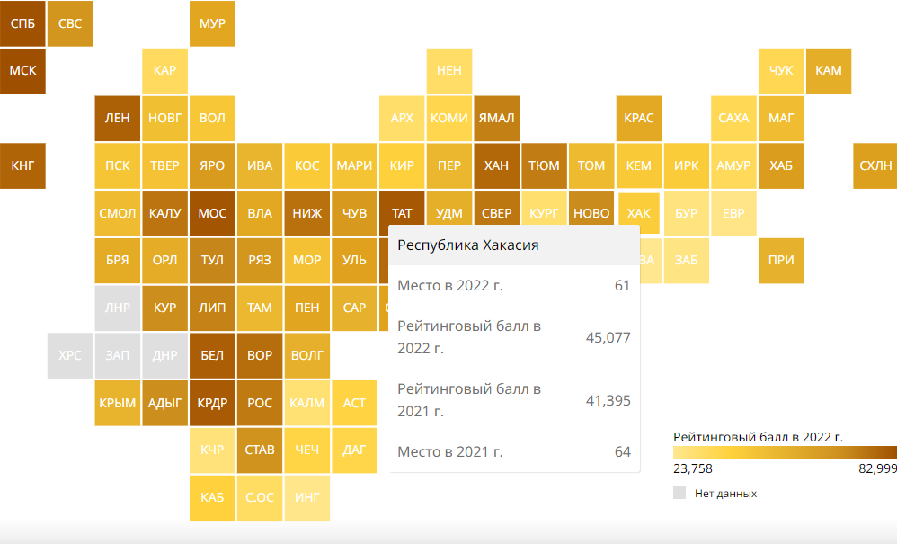 В России подвели итоги рейтинга по качеству жизни за 2022 год. Первые строчки рейтинга, как и годом ранее, занимают Москва, Санкт-Петербург и Московская область. В хвосте списка - Еврейская автономная область, Ингушетия и Тува . Хакасия на 61-м месте, между Омской и Иркутской областями (за год поднялась на 3 строчки).
