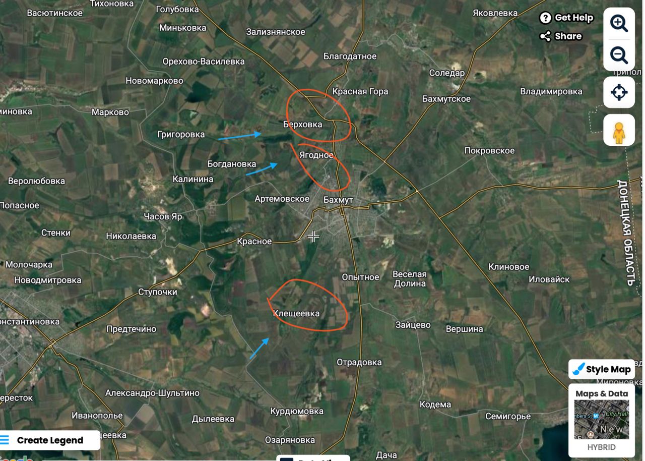Изначально ВСУ пытались наступать на двух флангах в районе Берховки и Клещеевки. Замысел заключался, видимо, в том, чтобы отрезать с двух сторон Бахмут от снабжения (см. Карту 1). Напомню, для сравнения, что противостоит врагу тут наша группировка около 20 тысяч человек. То есть в пять раз меньше.