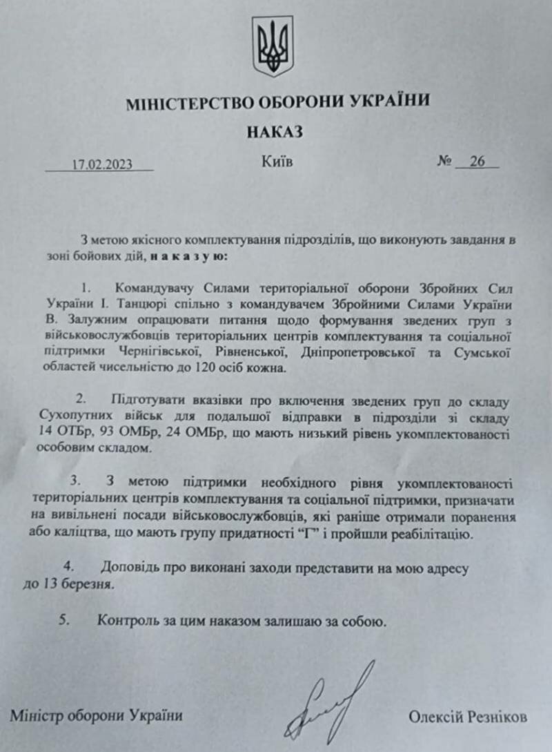 Глава украинского минобороны Алексей Резников подписал приказ, согласно которому предполагается формирование сводных групп, состоящих из сотрудников военкоматов Сумской, Черниговской, Днепропетровской и Ровенской областей. В каждую из этих групп войдут до 120 человек.