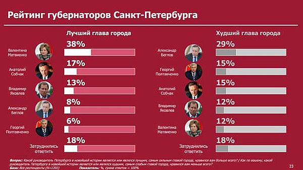 В опросе АСИ 29% респондентов назвали Беглова худшим губернатором, что поставило градоначальника на первое место в рейтинге. Как полагает политолог Владимир Соловейчик , горожане больше всего недовольны именно законом о «новой реновации».