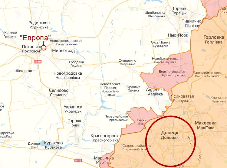 Telegram-канал “Воин DV” дает точные координаты пораженного объекта ВСУ (48.296225 37.221274), из которых становится понятно, что гостиница “Европа”, куда попал российский ОТРК “Искандер-М”, находится в селе Ровное в Покровском районе Донецкой области. Этот населенный пункт расположен на трассе Т0504 между Мирноградом и Покровском и в 50 км от Авдеевки, за которую сейчас российская армия ведет тяжелые бои ВСУ.