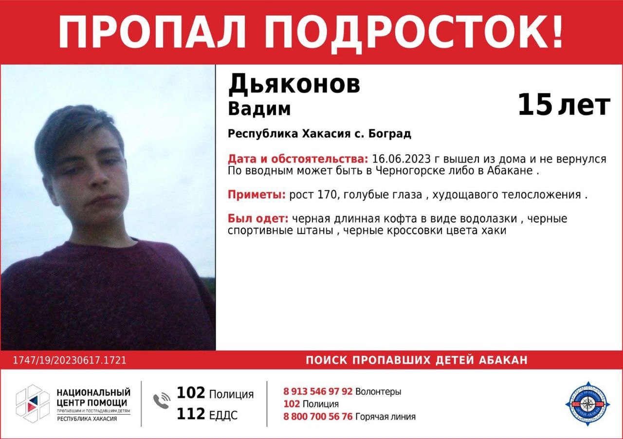 Всем, кто знает местонахождение пропавшего, просьба позвонить по телефонам: 102 и 112, 8-913-546-97-92 (волонтеры, круглосуточно). Источник изображения: Национальный центр помощи детям