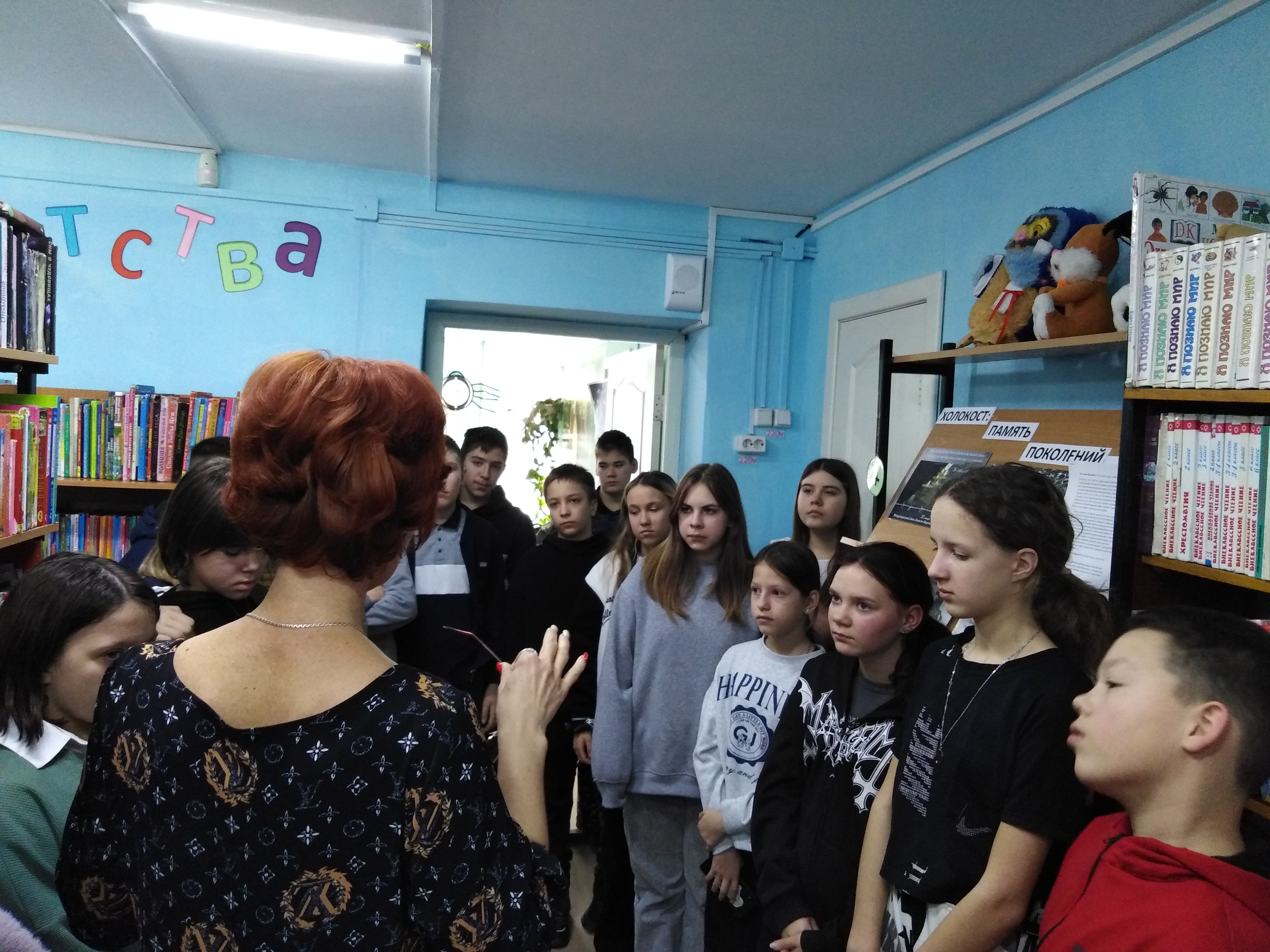 23 января прошла беседа для группы ребят, в ходе которой они узнали значение слов «холокост» и «геноцид», о том, что Холокост - часть истории нашей страны: около половины всех жертв Холокоста жили на территории СССР. В широком смысле Холокост - массовое истребление народа. Жертвами Холокоста стали не только евреи, но и представители других народов. Было рассказано о трагедии Бабьего Яра. На выставке ребята рассматривали фотографии памятников жертвам Холокоста. Например, один из самых пронзительных мемориалов в Будапеште, который расположен вдоль набережной Дуная недалеко от здания парламента и представляет собой ряд из шестидесяти чугунных пар женских, мужских и детских ботинок, лежащих у края набережной. Именно на этом месте нацисты расстреливали евреев группами по 50-60 человек и сбрасывали убитых в реку.