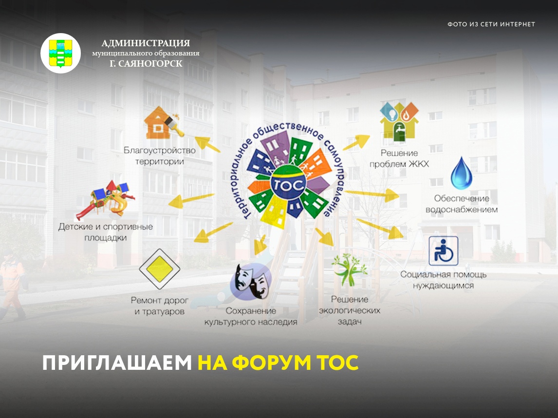 На форуме расскажут: - о том, как создать ТОС; - о дополнительных возможностях для развития придомовых территорий; - о взаимодействии ТОС с организациями МО г. Саяногорск.