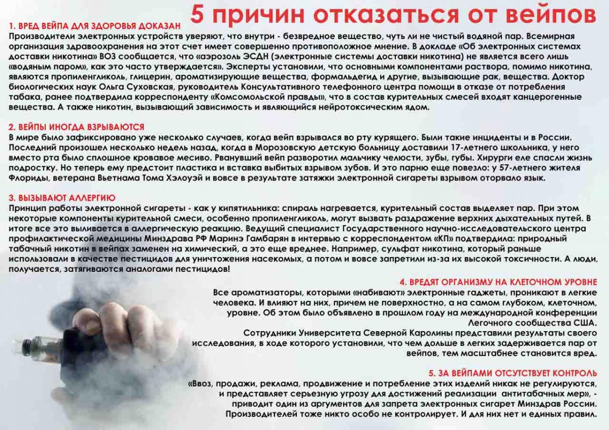 Курение вредно и опасно, каким бы образом оно ни осуществлялось. Ни табачные изделия, ни вейпы, ни кальян, ни электронные сигареты не принесут никакой пользы. Надо всегда помнить об этом.