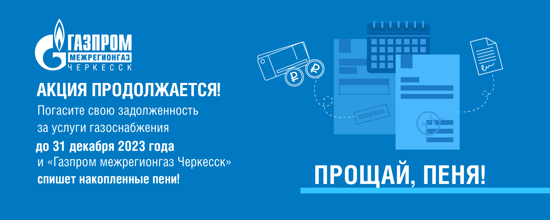 «Акция продолжается! ООО «Газпром межрегионгаз Черкесск»продлил акцию «Погаси долг без уплаты пени» для жителей Карачаево-Черкесской республики до 31 декабря.