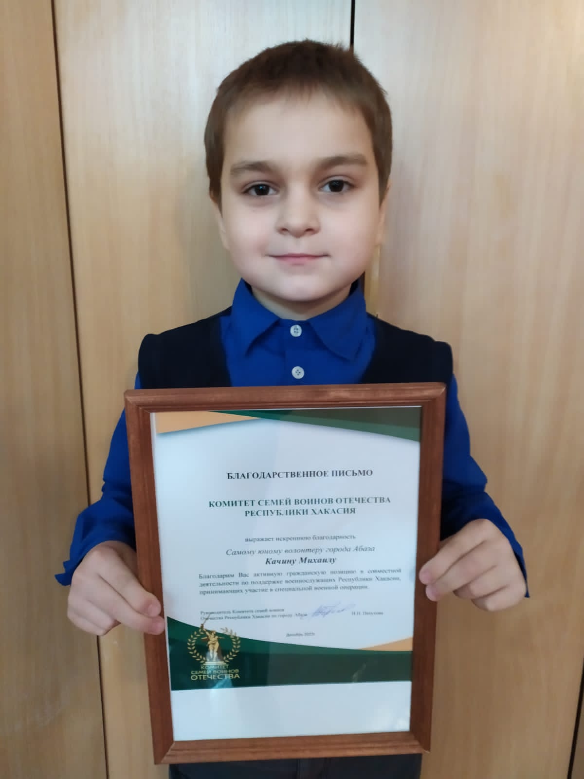 Вчера прошел замечательный праздник День волонтера. Мы привыкли, что волонтерами являются подростки и взрослые. Но в нашем городе есть такой серьезный парень 8 лет Качин Михаил, который является самым молодым волонтерам нашего города. Мише 8 лет и вот уже год он помогает нашей организации КСВО по г. Абазе. Миша со своей мамой Бутанаевой Ириной помогают парням находящимся в Украине. Этот маленький, но такой большой мальчишка на ровне со взрослыми заливает окопные свечи, пакует посылки для отправки нашим парням, старается помочь чем может и может даже больше, а ведь этот мальчишка учится во втором классе школы № 50. И когда сегодня я пришла его наградить благодарственным письмом от нашего комитета для учителя и одноклассников был большой сюрприз, что Миша волонтер.
