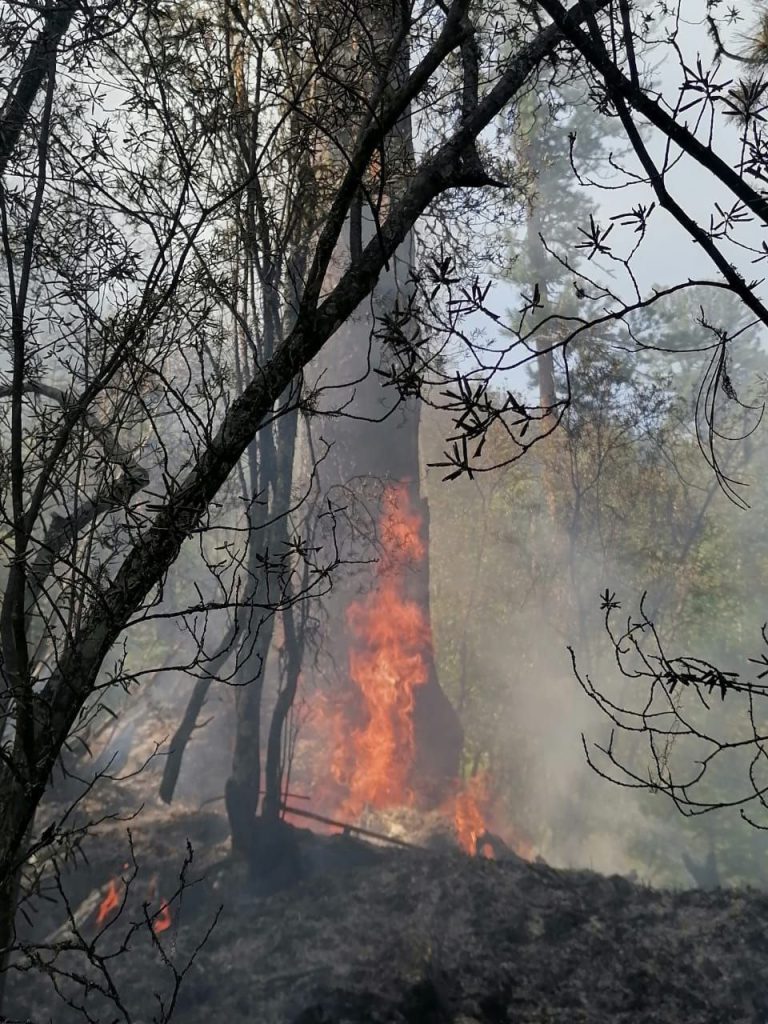 Одно из обуглившихся деревьев в месте, где ударила молния, рухнуло со скалы, еще несколько полыхали у корней.