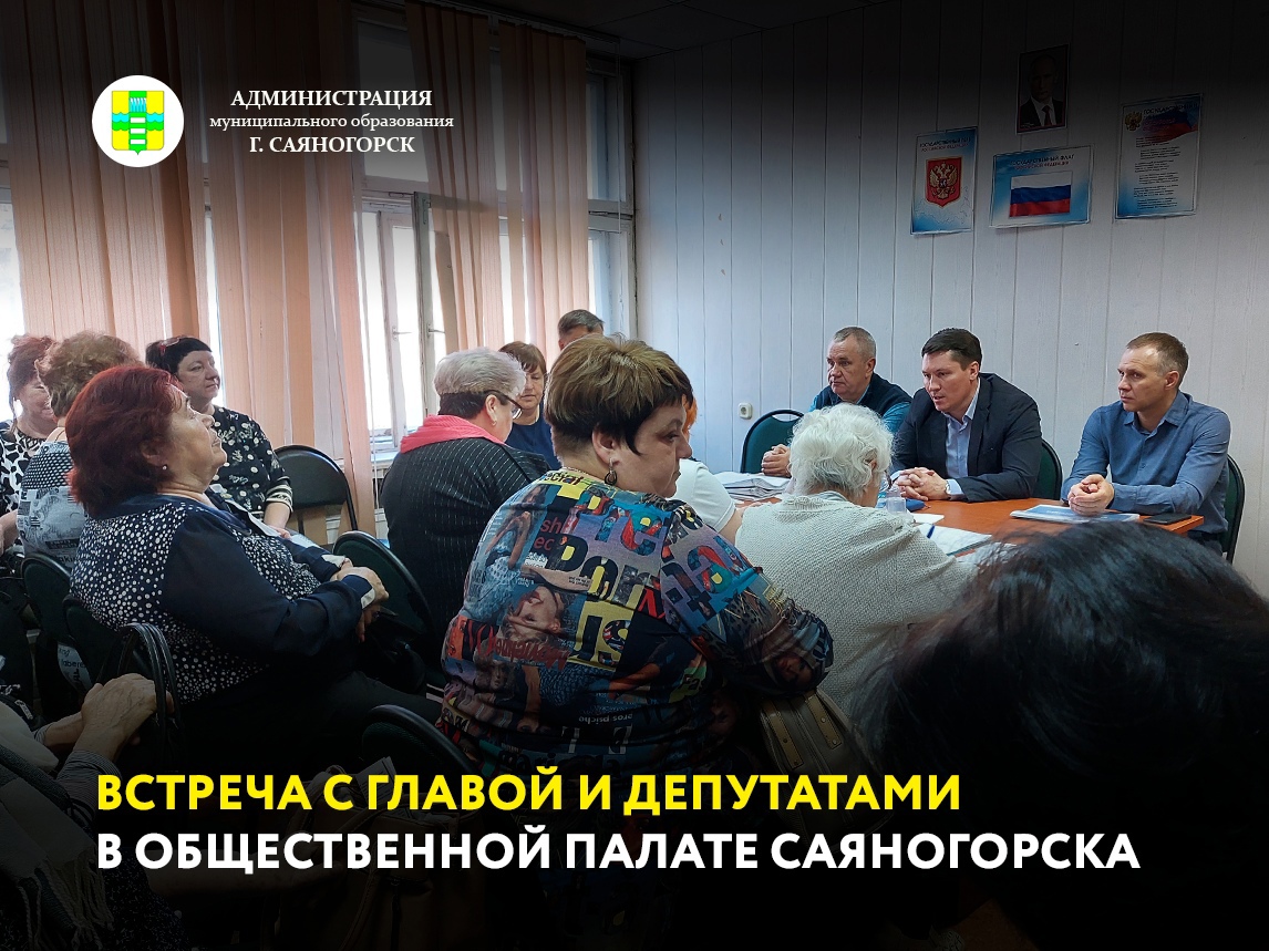 В Общественной палате МО г. Саяногорск прошла встреча Главы МО г. Саяногорск Евгения Молоднякова с руководителями общественных организаций муниципалитета. На встрече также присутствовали председатель Общественной палаты Саяногорска Андрей Патюков , депутаты шестого созыва Совета депутатов МО г. Саяногорск Вадим Дорошенко и Роман Чеглов .