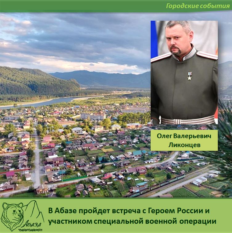В Центральном доме культуры г. Абазы 22.09.2023 года в 14.15 часов проведёт встречу с жителями города Ликонцев Олег Валерьевич, участник специальной военной операции, командир батальона «Сибирь», Герой России.