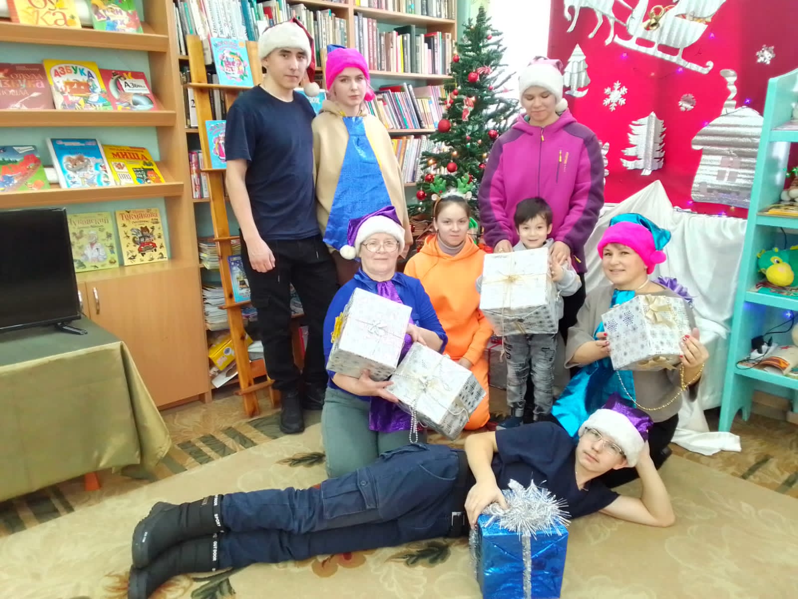 Библиотекарь рассказала, какие зимние забавы были у наших предков, и чем они занимались в новогодние праздники, ребята активно отвечали на вопросы викторины «Новогодние приключения литературных героев», приняли участие в играх «Самый быстрый», «Самый меткий» и «Горшочек» где нужно было завязанными глазами с помощью палки найти и сбить перевернутый горшочек с подарком.