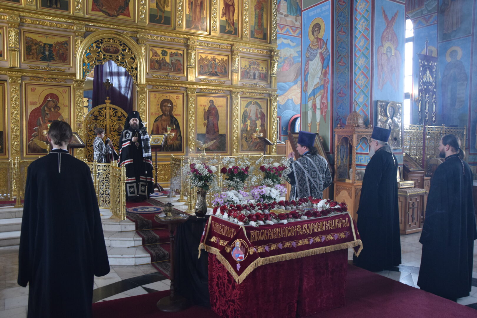 По заамвонной молитве Владыка совершил освящение хлеба и вина, положенное в этот день. Завершилось богослужение целованием святой Плащаницы.