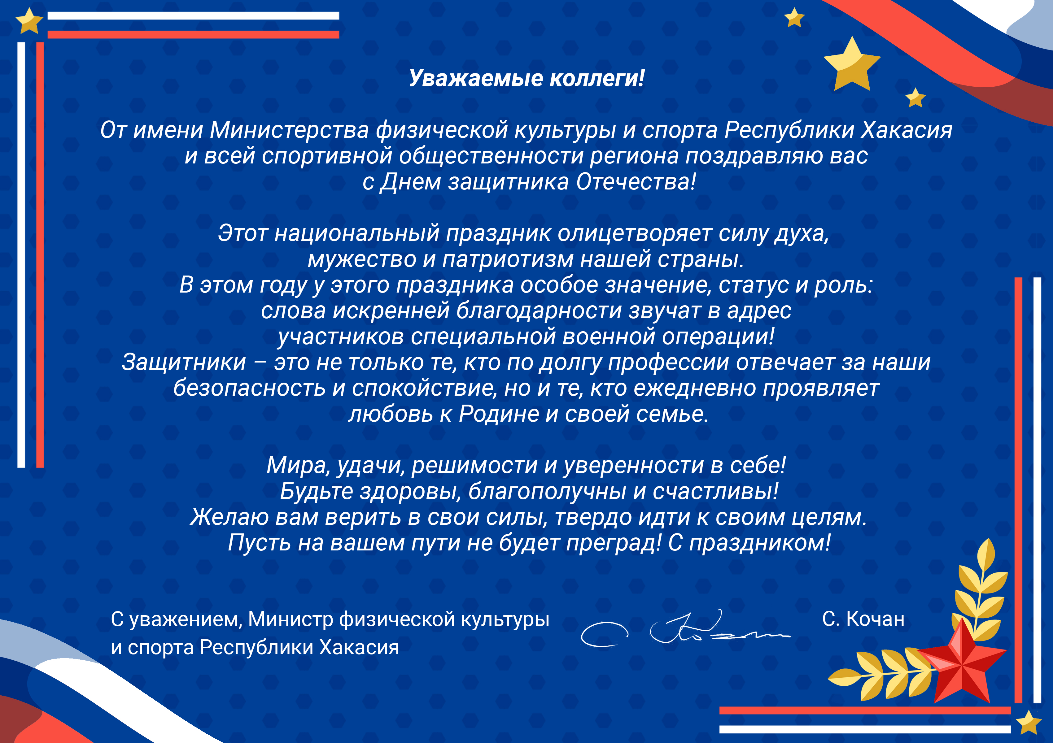 Поздравление с праздником министра физической культуры и спорта Хакасии Сергея Кочана.