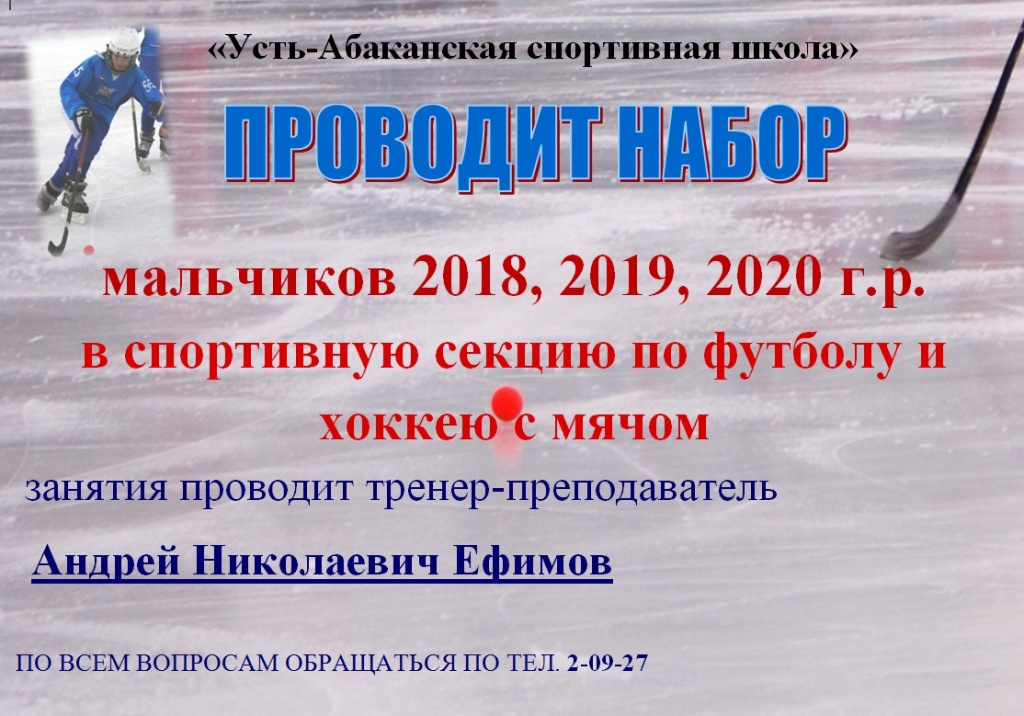 Усть-Абаканская спортивная школа проводит набор мальчиков 2018, 2019, 2020 годов рождения в секцию хоккея с мячом и футбола. Тренер-преподаватель Андрей Николаевич Ефимов