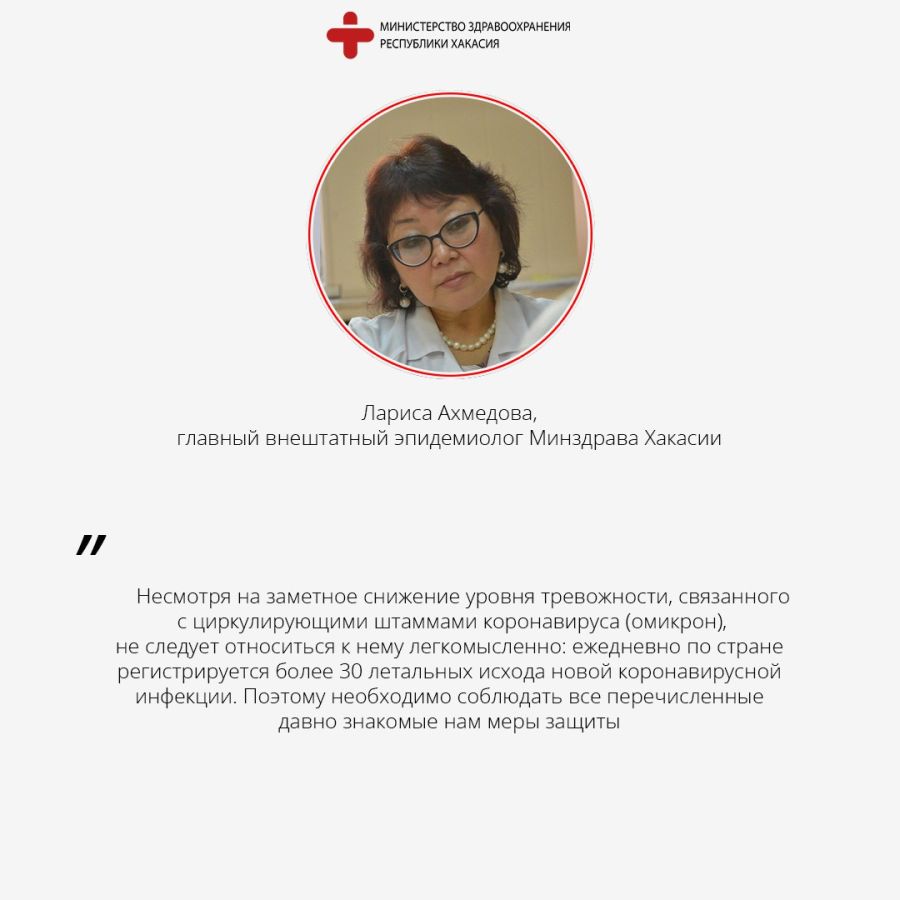 - Несмотря на заметное снижение уровня тревожности, связанного с циркулирующими штаммами коронавируса (омикрон), не следует относиться к нему легкомысленно: ежедневно по стране регистрируется более 30 летальных исходов новой коронавирусной инфекции. Поэтому необходимо соблюдать все перечисленные давно знакомые нам меры защиты , - отмечает главный внештатный эпидемиолог Минздрава Хакасии Лариса Ахмедова.