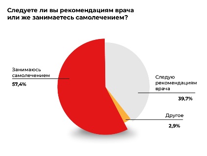 Однако в данном опросе было выявлено, что количество людей, следующих рекомендациям медицинских специалистов составило 57%. Интересно то, что на данный момент увеличилось количество молодых людей с ответственным отношением к своему здоровью. Например, среди участников исследования в возрасте от 18 до 24 лет, к рекомендациям врачей прислушиваются 63% опрошенных.