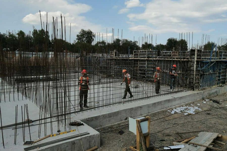 Строительные работы на объекте ведутся с весны 2023 года. Сейчас подрядчик осуществляет устройство бетонной подготовки, устройство монолитной железобетонной фундаментной плиты, армирование и бетонирование монолитных железобетонных стен. Выполняется армирование стен. На объекте задействовано 32 человек рабочих и 1 единица техники.