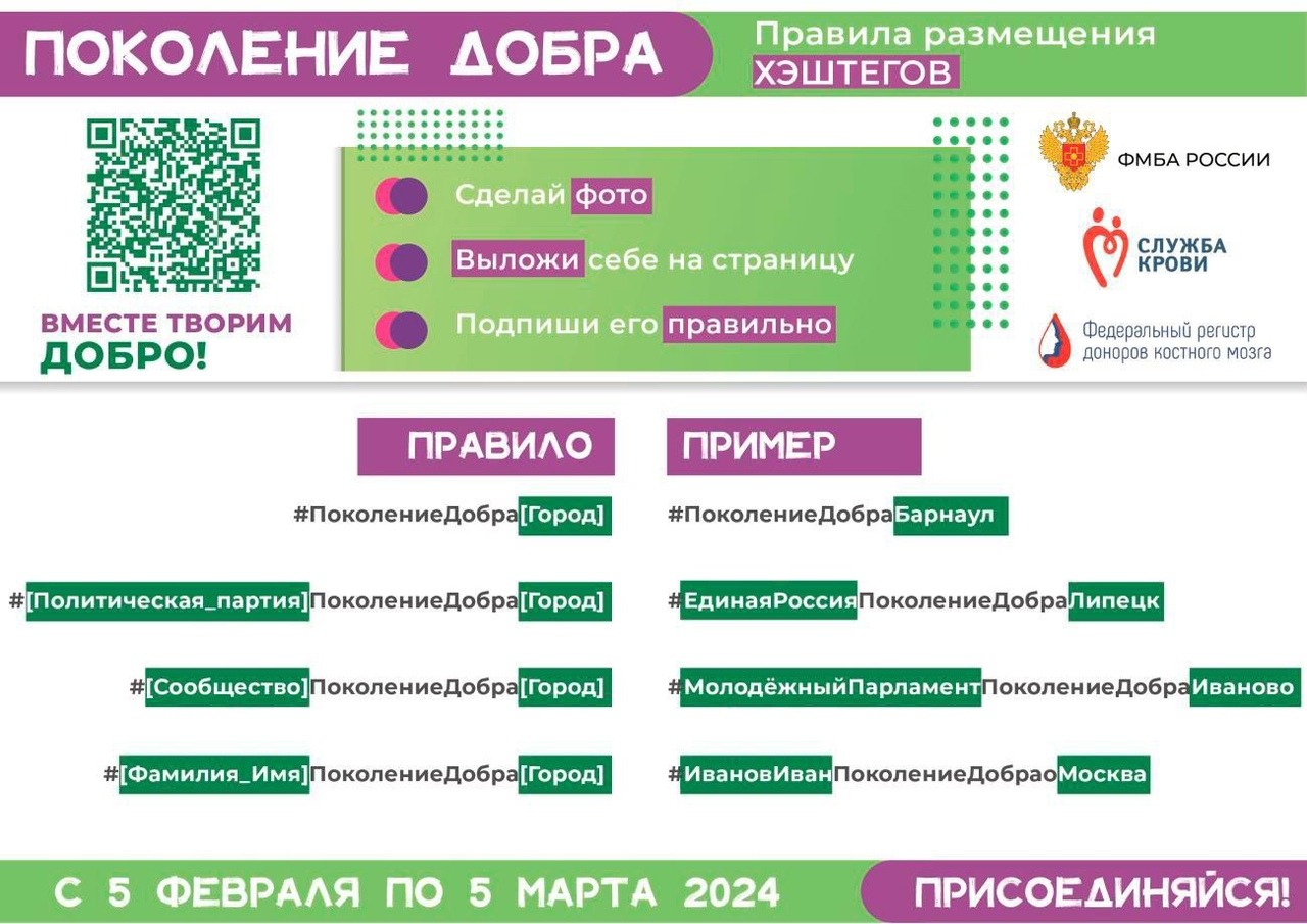 Изображение предоставлено пресс-службой Минздрава Хакасии С 5 февраля по 5 марта при поддержке Федерального медико-биологического агентства во всех регионах страны проходит Всероссийская донорская акция «Поколение добра».